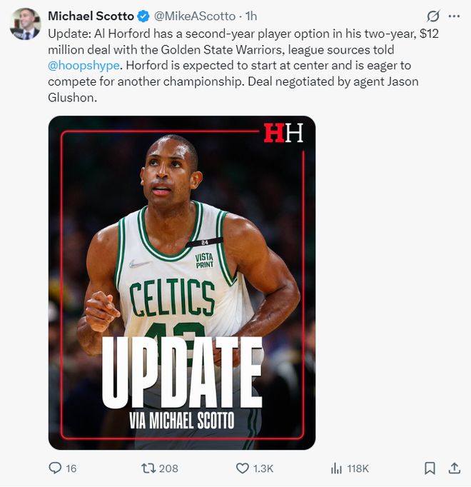 霍福德跟勇士队签下的是一份两年1200万的合同,第二年为球员选项,霍福德的合同细节,25-26赛季570万(全额中产特例),第二年为630万。